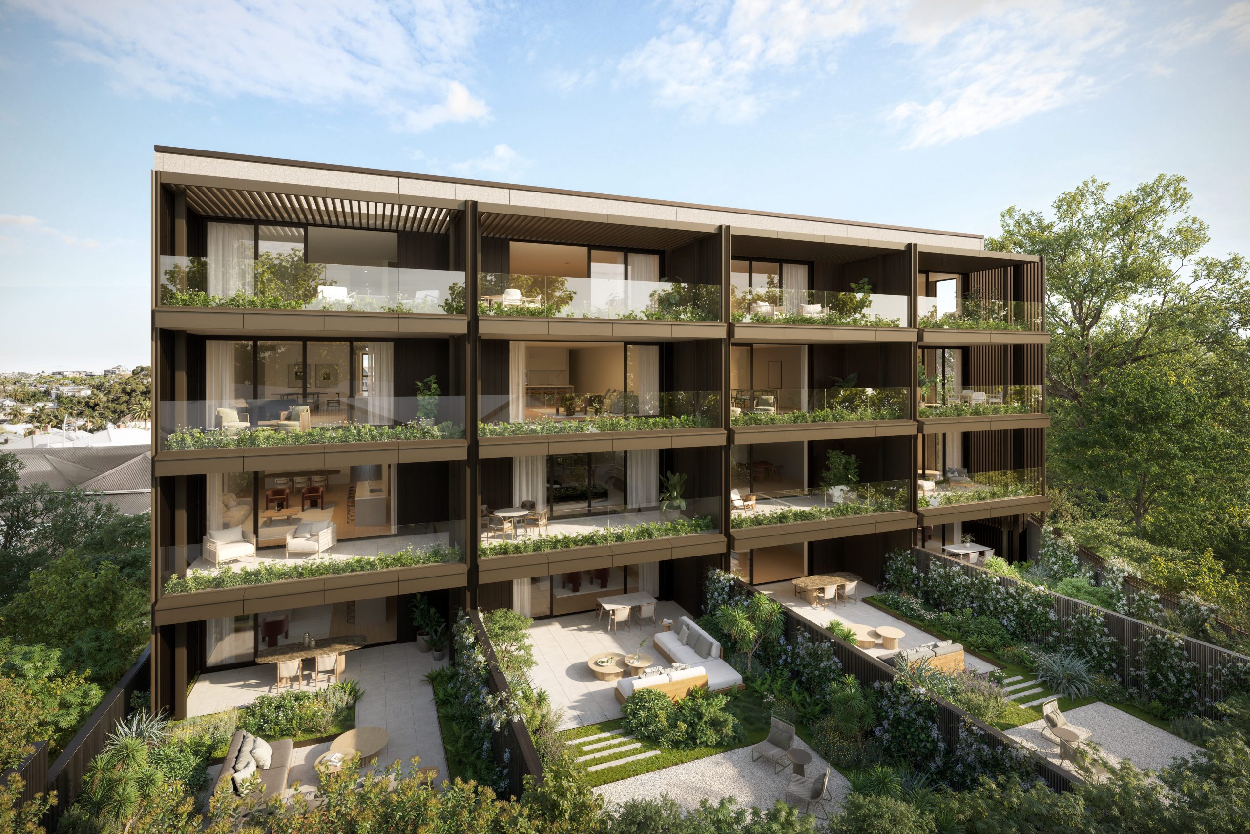 - Generous upper-level balconies and ground-level landscaped gardens