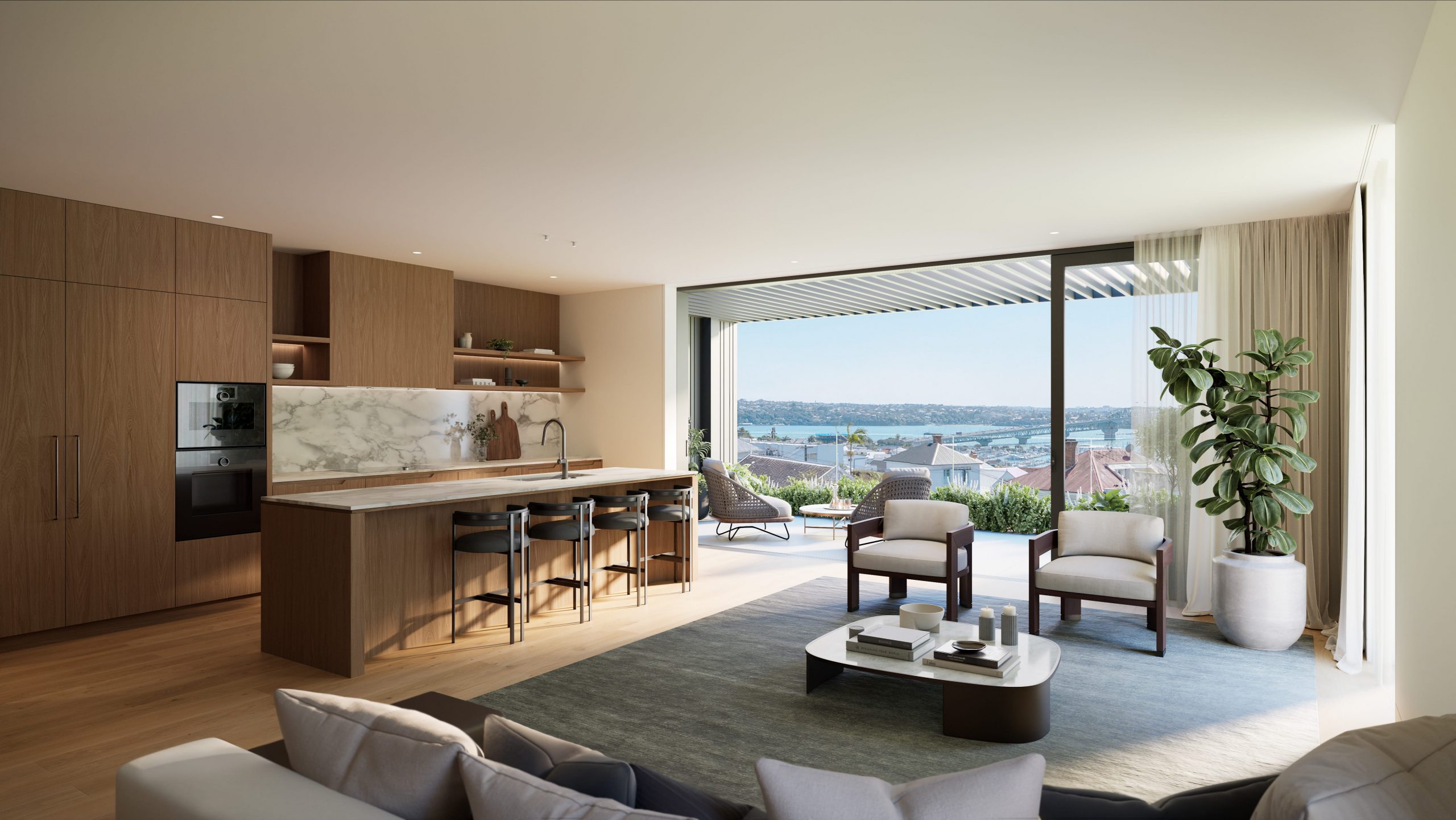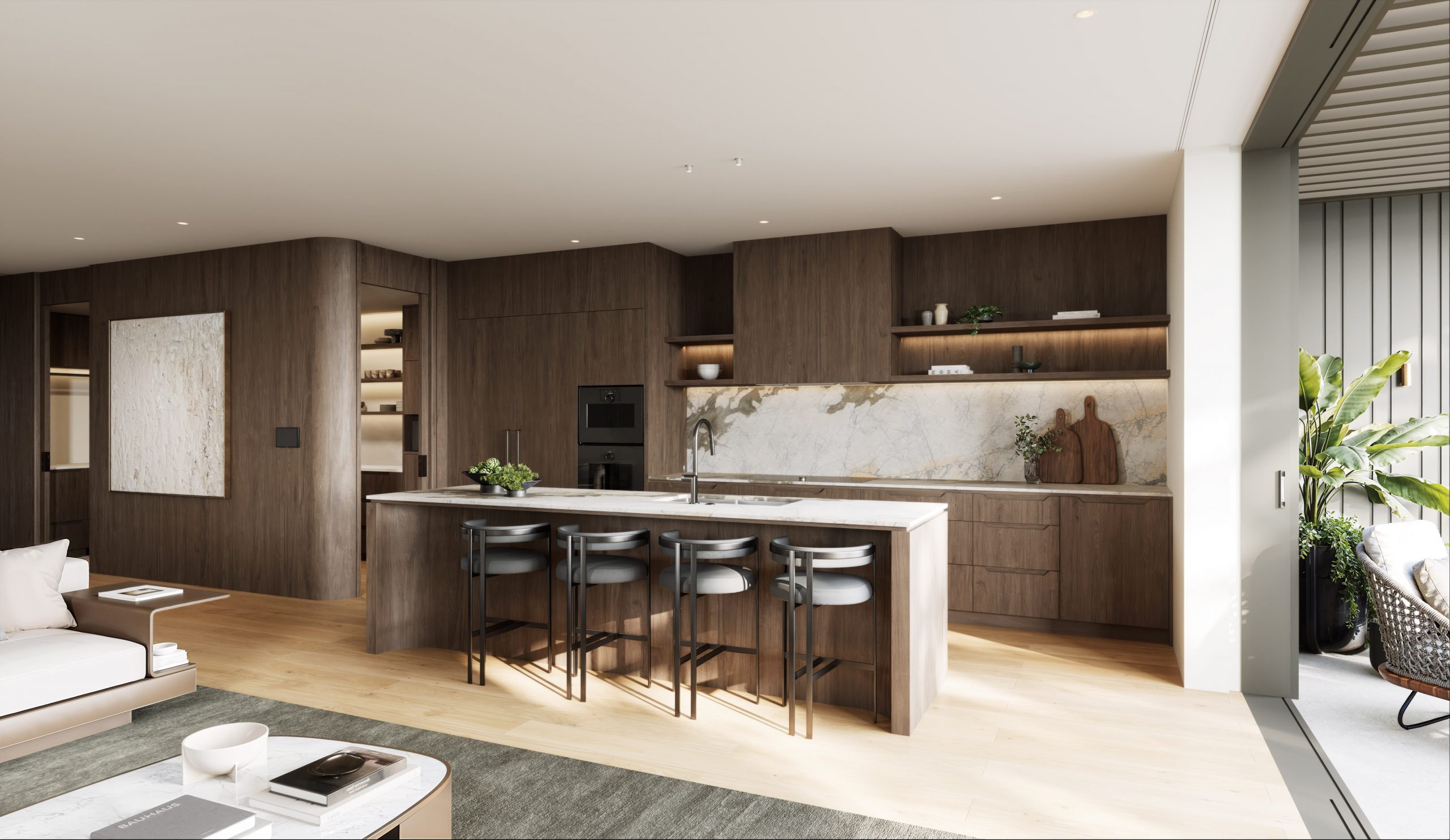 - Open-plan living anchored by a timber-veneer and marble kitchen