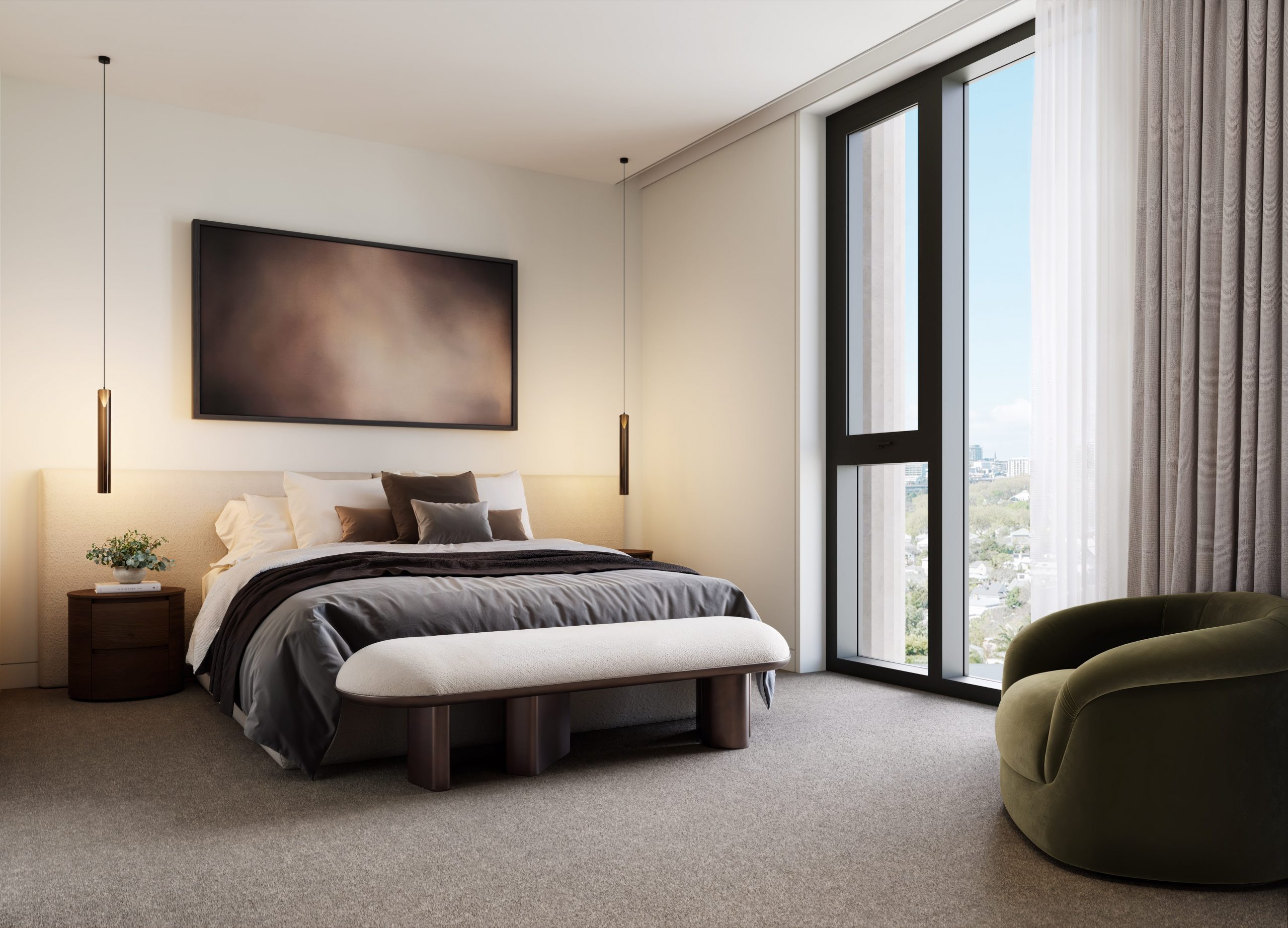 Perched on the elevated ridgeline of College Hill, this exceptional home at Pillars of College offers a rare combination of architectural distinction, light-filled interiors, and unrivalled harbour and city vistas. Crafted by renowned developer Precinct and curated by acclaimed architects Jasmax, the residence is defined by its striking fluted façade, elegant curves, and enduring contemporary design—a statement of refined urban living in one of Auckland’s most coveted precincts.